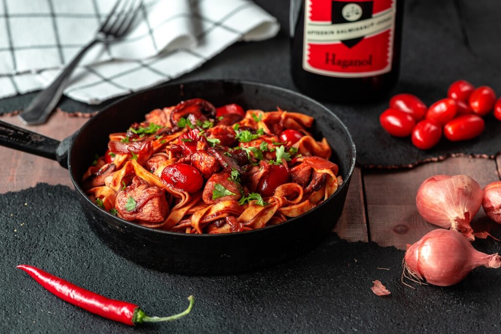 ミニトマトをそのまま使った太麺のチキンパスタに、BBQソースとサルミアッキの液体タイプを加えたメイン料理になる一品。