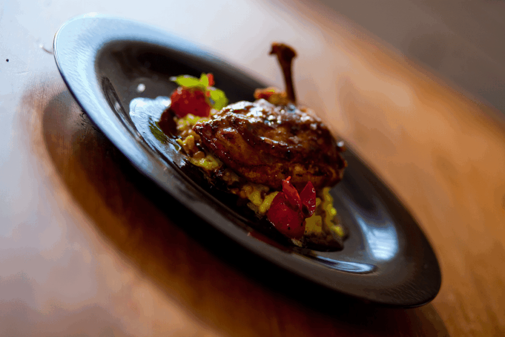 鶏胸肉のフライに、玉ねぎ、生姜、タイムの小枝オレンジの皮、液体タイプのサルミアッキを混ぜて作ったサルミアッキオレンジソースを鶏胸肉の上にかける鶏肉料理。